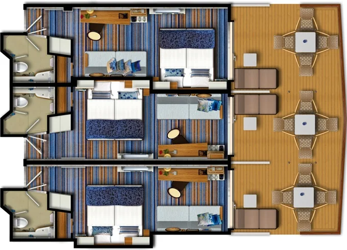 | VEPO - Kajuta s terasou Premium 17 m² + balkón 30 m² s 2 kreslami, 2 ležadlami a hojdacou sieťou. 7-11. paluba. Max 3 osoby. | 10 656 € 3 552 € za osobu |