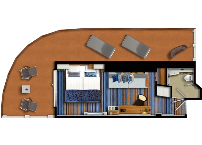 | VEPO - Kajuta s terasou Premium 17 m² + balkón 30 m² s 2 kreslami, 2 ležadlami a hojdacou sieťou. 7-11. paluba. Max 3 osoby. | 8 602 € 8 602 € za osobu |