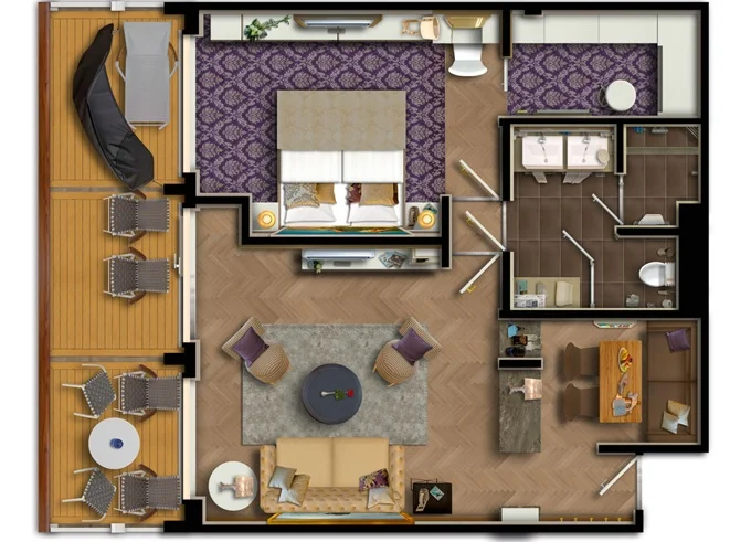 SUTO - Themen Suite 54 m² + balkón 15 m² so stolom, ležadlom a hojdacou sieťou. Spálňa, obývacia časť, šatník. 10. paluba. Max 4 osoby. Výhody Suite. 5 144 € 5 144 € za osobu