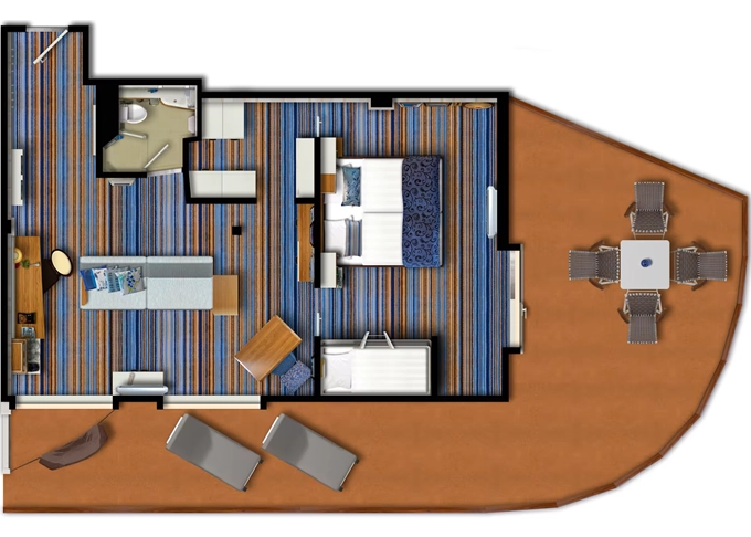 SUTO - Themen Suite 54 m² + balkón 15 m² so stolom, ležadlom a hojdacou sieťou. Spálňa, obývacia časť, šatník. 10. paluba. Max 4 osoby. Výhody Suite. 5 278 € 2 639 € za osobu