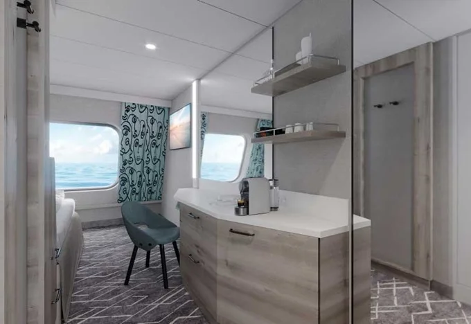 | SUWO - Weitblick Suite 45 m² + balkón 12 m² s hojdacou sieťou. Oddelená spálňa a obývacia časť, šatník. 14. paluba. Max 4 osoby. Výhody Suite. | 15 027 € 5 009 € za osobu | ||